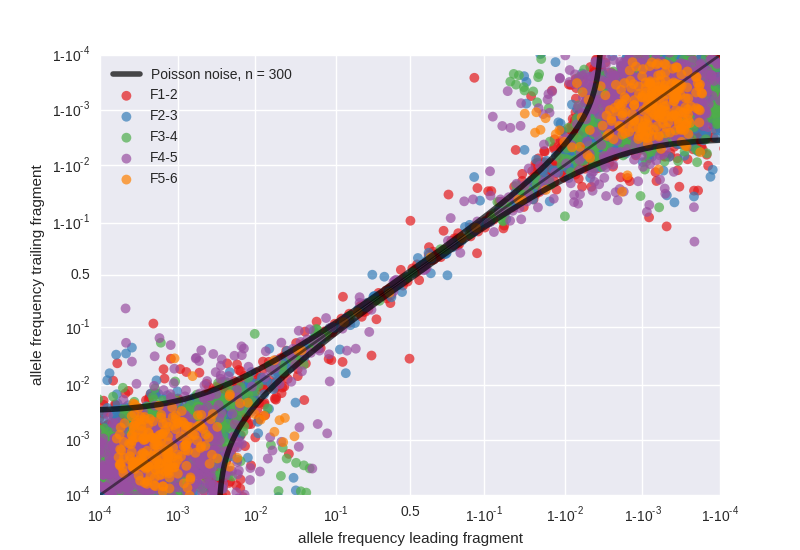 The figure shows the correlation between variant frequencies in the leading and trailing fragments, deviations from the diagonal signal PCR bias or low template input